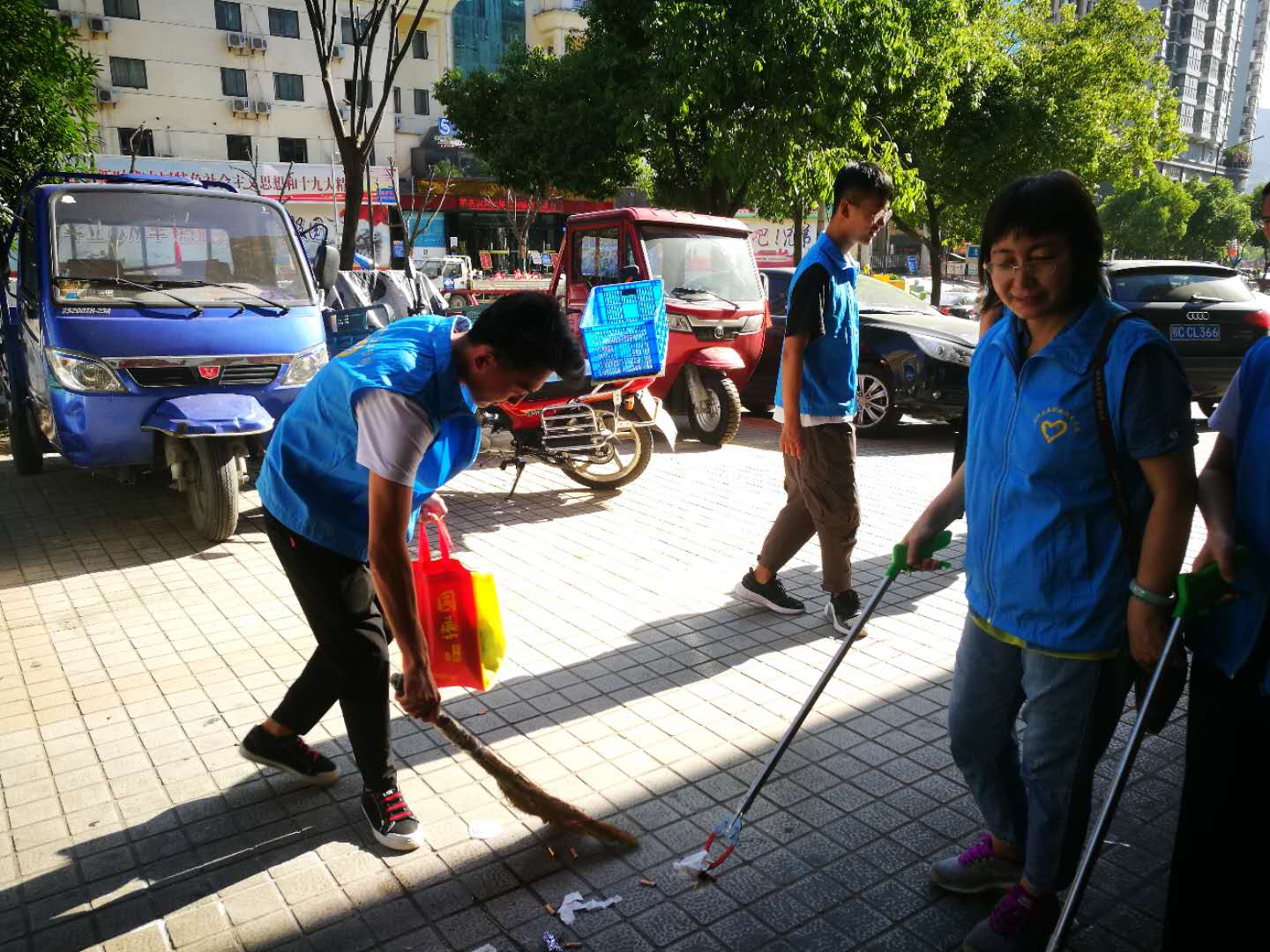 穿上统一志愿者服装,带着分发的劳动工具,大家在社区网格员的带领下,分成三组分别赶赴九号公馆、北京小镇及沿街商铺开展创文志愿服务。大家沿街清理不规范广告、捡拾垃圾、清扫地面,与小区物业人员一同清理杂草,入户向居民开展创文知识宣讲等。尽管天气炎热,汗水湿透了衣背,老师和同学们都干得不亦乐乎,没有一个人叫苦叫累。看着社区环境在大家的共同努力下,变得越来越洁净、文明,大家都感到由衷的高兴。