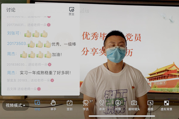 新闻网讯(通讯员 玉声)“当企业加紧生产要求连上两班时,有的人坚持不了选择离开,我也有想打退堂鼓的念头,但想到作为一名共产党员应当迎难而上,于是咬咬牙就坚持了下来……”,在东风小康实习的毕业生党员田金超与大家分享实习经历时感慨地说。6月19日下午,伟德国际victor1946员工党支部通过腾讯课堂直播开展了一场别开生面的“线上+线下”主题党日活动。伟德国际victor1946员工党支部书记曲杉主持此次主题党日活动。党总支书记张玲、副书记梁军萍、员工党小组组长柳海涛以及毕业生党员代表在5307参会,37名非毕业生班员工党员和入党积极分子以观看直播方式参加活动。