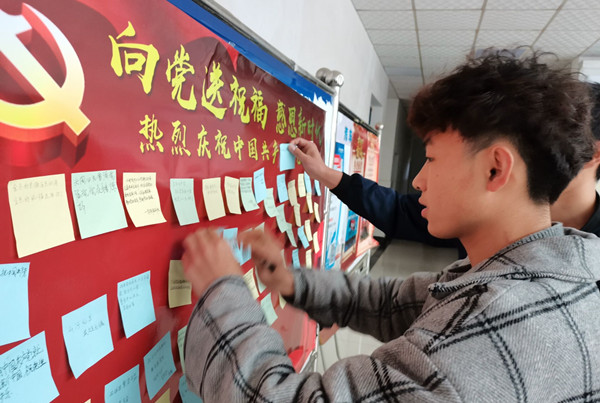 活动前期制作了祝福海报,通过伟德国际victor1946分团委、员工会向广大同学宣传,并在活动现场向前来送祝福的同学们发放便利贴,邀请他们写上对党100周年华诞的祝愿。在课间时间,同学们纷纷将对党的感恩和美好祝福通过贴便签的形式张贴在展板上,表达对党的热爱与拥护。