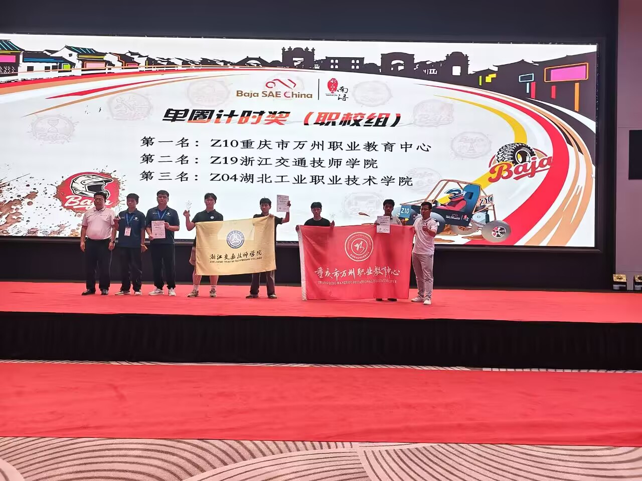 比赛期间,南浔赛场日均体感温度超40℃,赛道坡度陡增,驼峰落差扩大,炮弹路坑深加剧。在严苛环境下,师生团队展现出卓越的拼搏精神。在单圈计时赛环节,车手龙兴懿同学驾驶Z4赛车,在应对突发状况时沉着应对,以6分14秒的优异成绩力压众多985和211高校,勇夺职校组第三名。这一突破性表现不仅刷新车队历史记录,更印证了公司在汽车操控技术领域的教学效果。